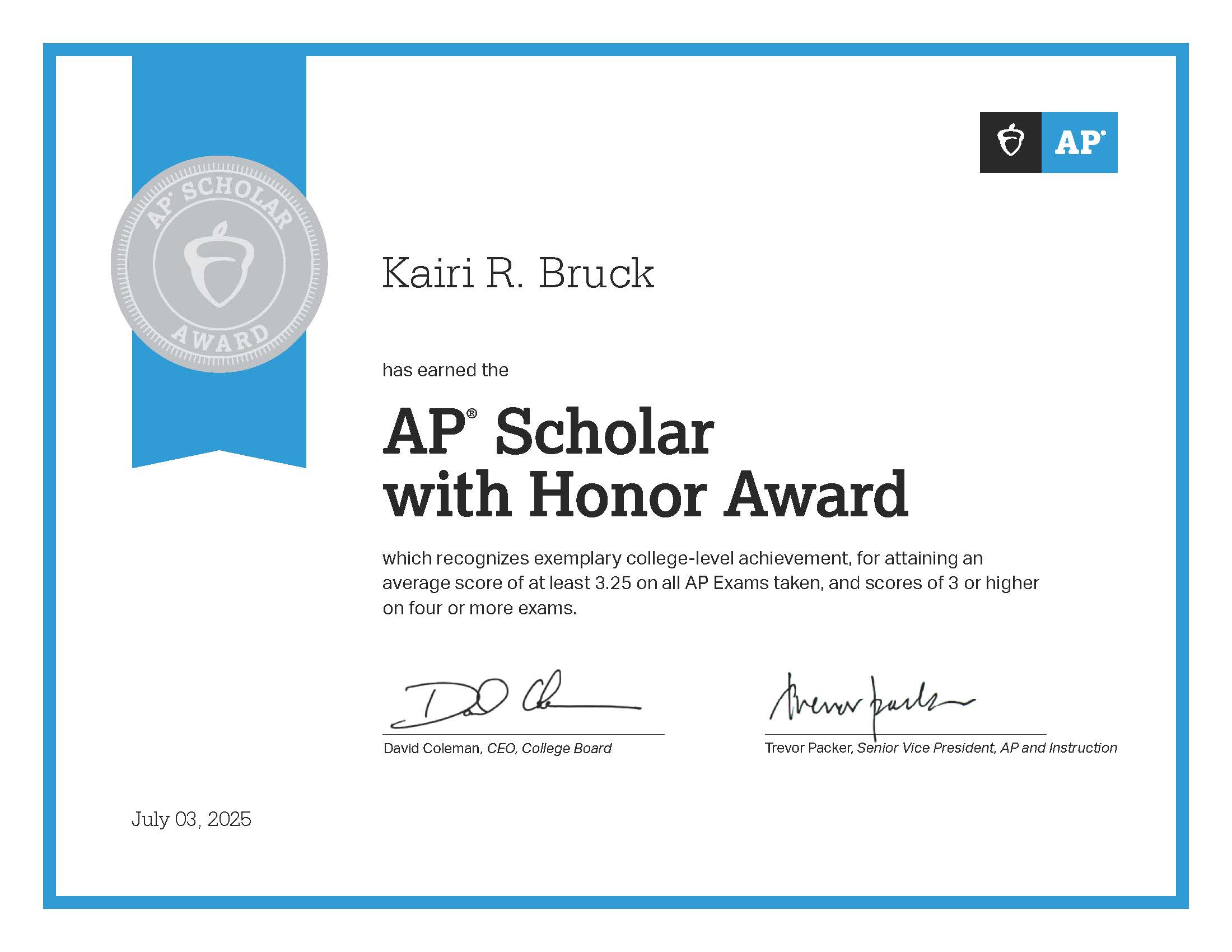 - AP Scholar with Honor, College Board